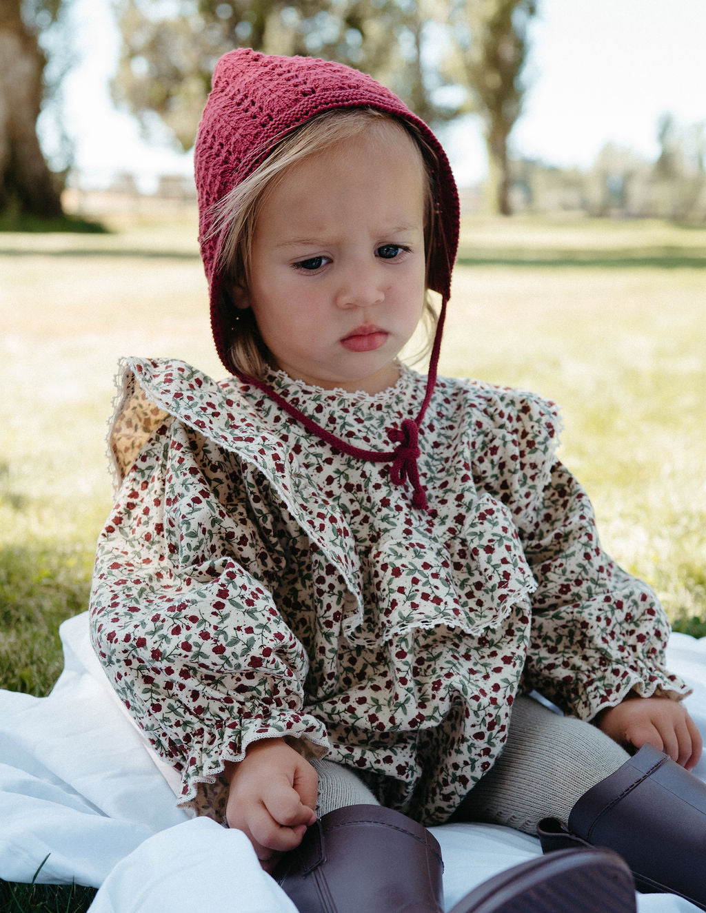 A timeless Christmas romper with vintage florals and delicate ruffle details—perfect for holiday moments and family outings.